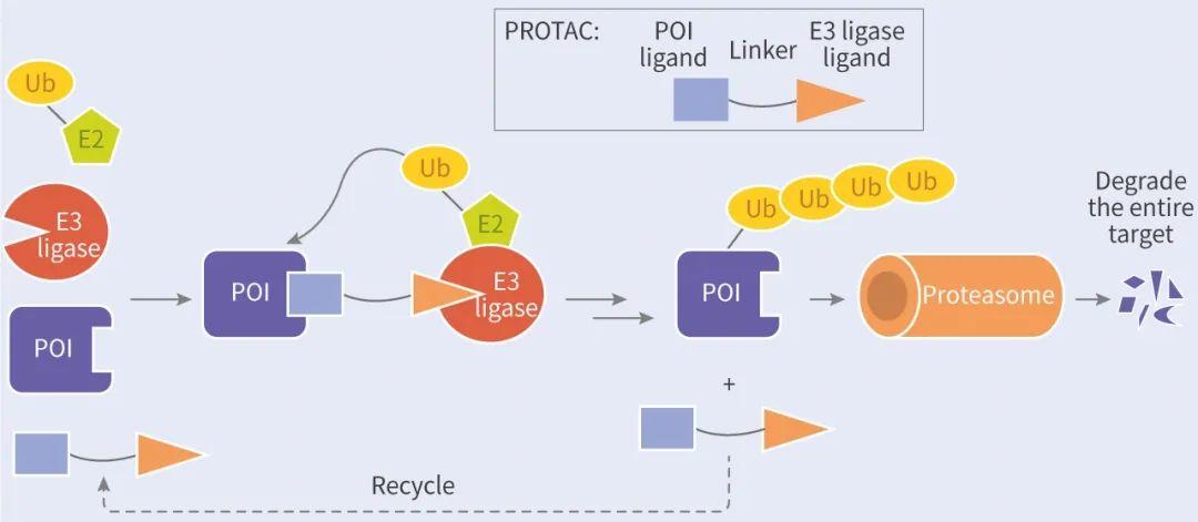 PROTACs have opened a new chapter for the development of new drugs and novel chemical knockdown tools and brought unprecedented opportunities to the industry and academia, which are heterobifunctional small molecules consisting of a ligand that binds to an E3 ligase, connected by a linker to another ligand that binds to the protein of interest (POI).